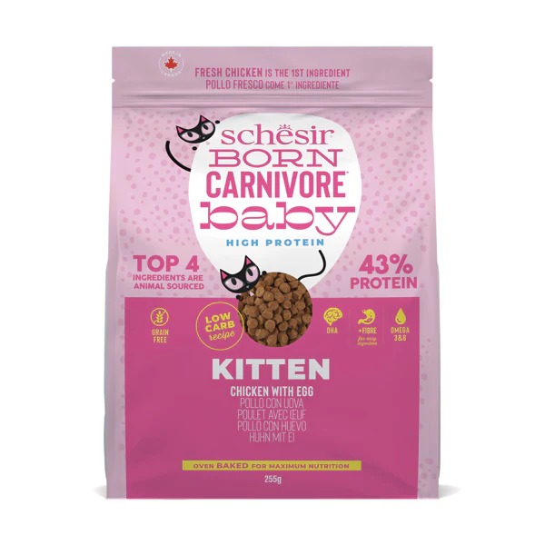 With a high protein content ≥43% and a low carbohydrate content ≤ 10%, the new SchesirBorn Carnivore range is the perfect food for true carnivores, even very young ones!