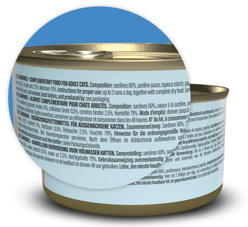 All the new recipes are made from natural, wholesome raw materials, essential for providing your cat with a nourishing and balanced diet, and for ensuring long-lasting health. The tasty and nutritious primary ingredients of these complementary wet foods are real sardine cuts.