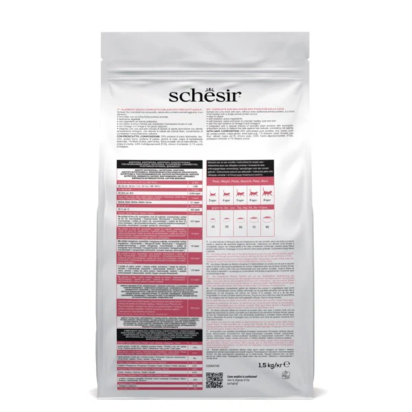 For proper, complete and balanced feeding, it is essential to provide both dry and wet Schesir food to the cat on a daily basis. The transition to the new food should be gradual. The quantities indicated refer to the feeding of the dry product alone, or combined with the wet and may vary according to the specific needs of the animal. The doses indicated refer to the administration of only the dry product as is and may vary in relation to the specific needs of the animal. Alternating with Schesir wet foods is advisable, although not essential for nutritional completeness. Always leave fresh water available. The transition to the new food must be gradual.