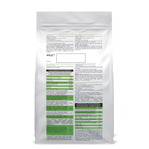 Formulated with a single source of animal protein (lamb), which is also the first ingredient, this is a tasty, easily digestible, complete and balanced meal to satisfy the nutritional needs of adult cats of all breeds. With biotin and brewers’ yeast, helping to maintain the well-being of fur and skin.