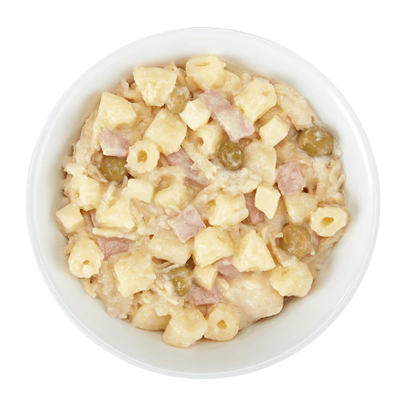The chicken fillets are combined with pasta and tasty pork, plus peas, cheese and eggs: a complete and balanced meal that is inspired by the celebrated and exquisite carbonara pasta dish, offering your dog the quality of the ingredients in a delicious combination of flavours.