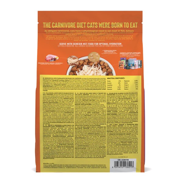 For proper, complete and balanced feeding, it is essential to provide both dry and wet Schesir food to the cat on a daily basis. The transition to the new food should be gradual. The quantities indicated refer to the feeding of the dry product alone, or combined with the wet and may vary according to the specific needs of the animal. Leave fresh water available at all times