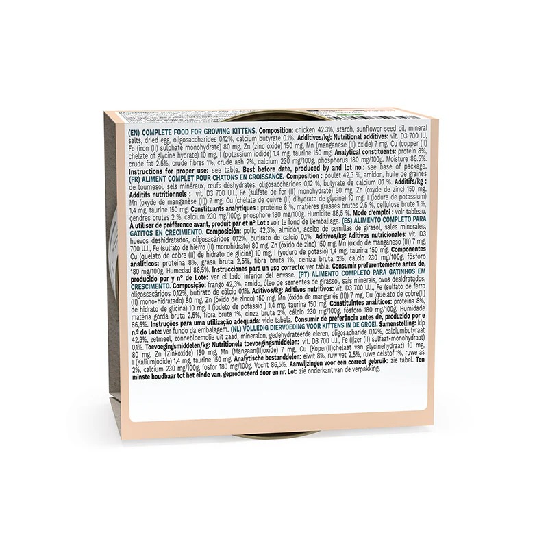 Recipe based on real chicken fillets enriched with highly nutritional egg protein and taurine to support neurological development. This smooth mousse is ideal for growing kittens from 3 to 12 months.
