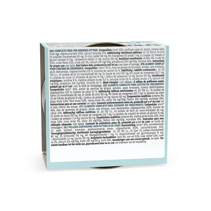 Recipe based on real tuna fillets enriched with highly nutritional egg protein and taurine to support neurological development. This smooth mousse is ideal for growing kittens from 3 to 12 months.
